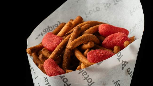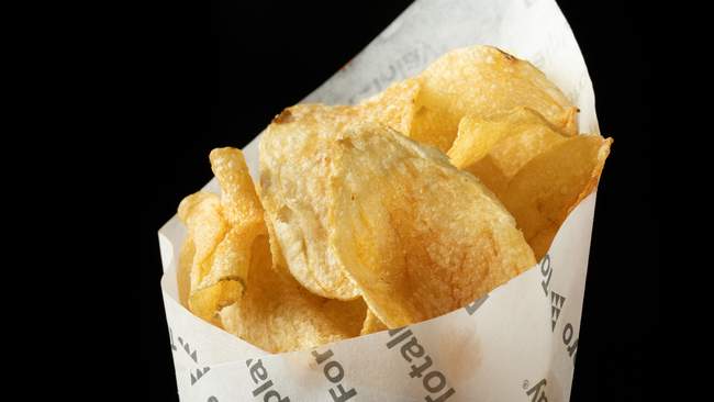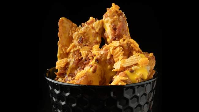 Papas gajo (250 gr), tocino (50 gr), queso amarillo (30 gr), papas Ruffles (10 gr) y salsa catsup (20 gr).